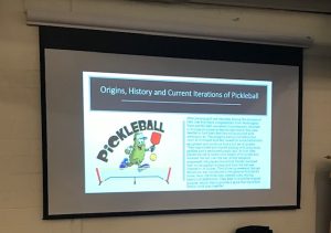 Program – Our program today was presented by Rick Swaim. He shared the history, development and how to play Pickleball. Rick was assisted by Tammy Smith, Martin Becker, Ben Snyder, Lester Pierce and Bob Rich as they shared their experiences playing Pickleball.