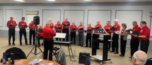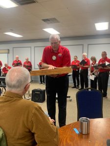 Veterans Program – The Optimist Singers regaled us with a collection of patriotic songs. Jim Kessler reenacted the presentation of a flag to the parents of a fallen soldier. Luke Becknell shared a story of his Grandfather that served in the military in World War I. Veterans and families of Veterans were recognized through song.